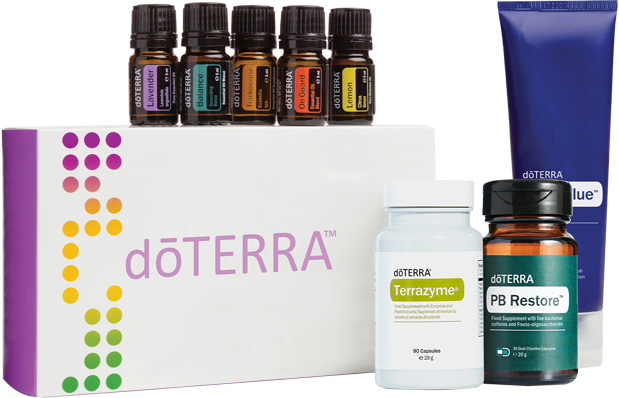 On Guard™ (5 ml), doTERRA Balance™ (5 ml), Frankincense (5 ml), Lemon (5 ml), Lavender (5 ml), Deep Blue™ Rub, PB Restore™, doTERRA Lifelong Vitality Pack, TerraZyme™