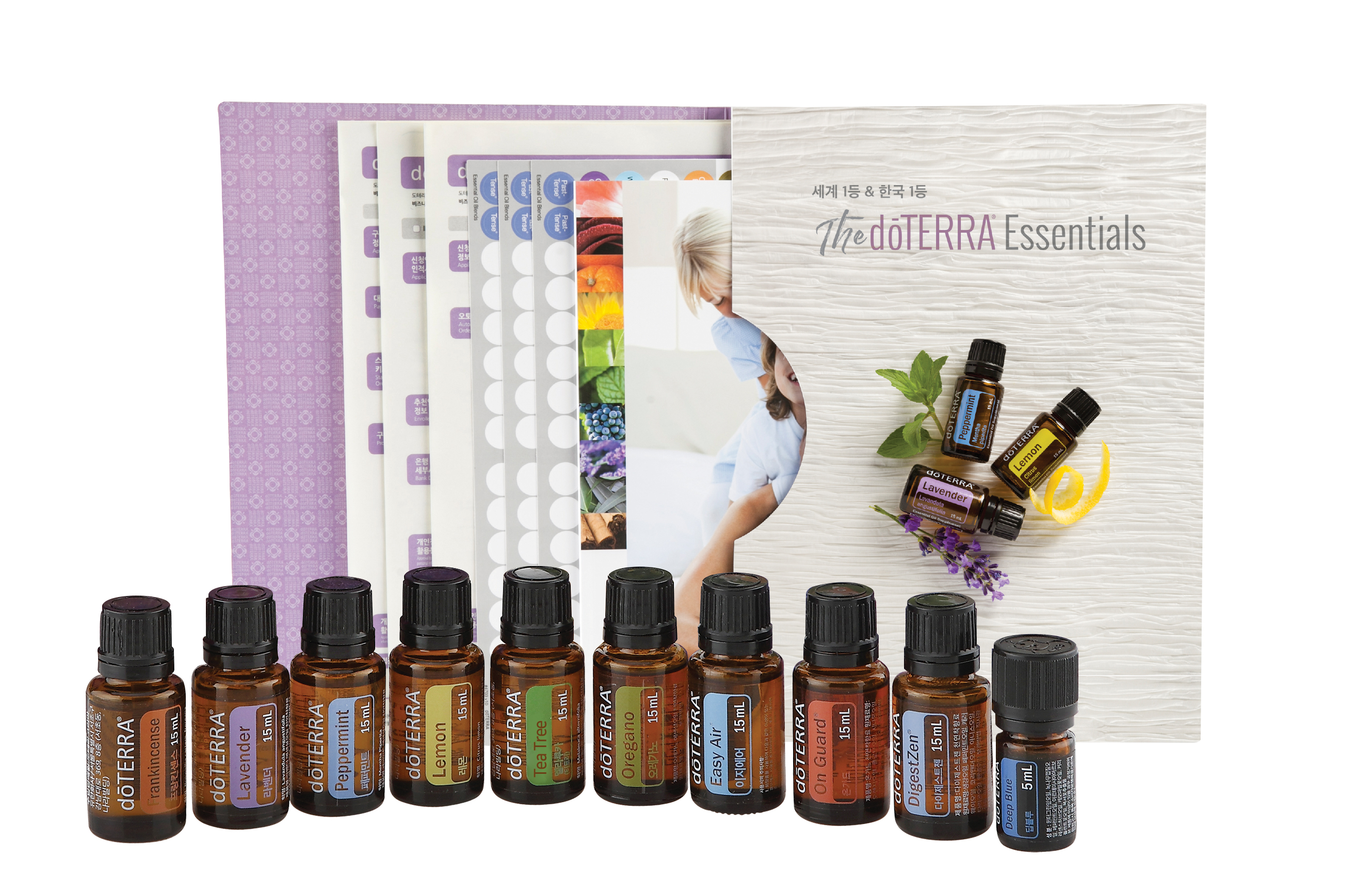 프랑킨센스 15ml, 라벤더 15ml. 레몬 15ml, 티트리 15ml, 오레가노 15ml, 페퍼민트 15ml, 이지에어 15ml, 온가드 15ml, 다이제스트젠 15ml, 딥블루 5ml. IPC 등록패킷