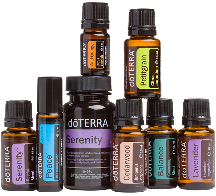 doTERRA «Баланс» (15 мл), Кедр (15 мл), Лаванда (15 мл), Петитгрейн (15 мл), doTERRA «Пис» (флакон 10 мл, с шариком), doTERRA «Серенити» (15 мл), Дикий апельсин (5 мл), doTERRA «Серенити» в капсулах
