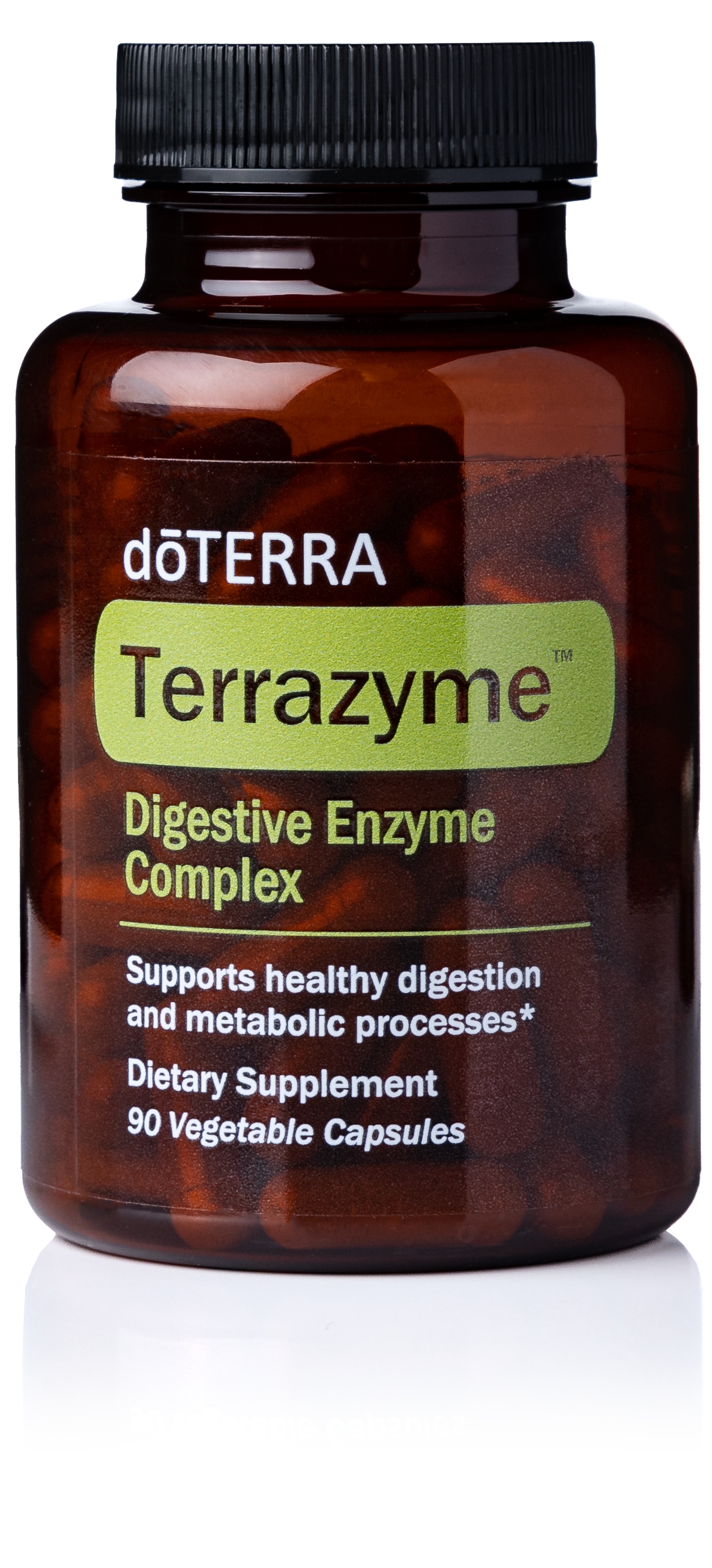 dо̄TERRA TerraZyme Digestive Enzyme Complex is a proprietary blend of active whole-food enzymes and supporting cofactors that are often deficient in cooked, processed, and preservative-laden foods. These powerful digestive enzymes support the body’s constant production of enzymes that are critical for healthy biochemical functions, including efficient digestion of food nutrients and cellular metabolism of nutrients into energy. dо̄TERRA TerraZyme includes a variety of whole-food enzymes that help with digesting proteins, fats, complex carbohydrates, sugars, and fibre.