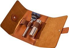 Maszynka oraz pędzel mieszczą się w eleganckim etui podróżnym, zaprojektowanym z myślą o stylowym wyglądzie i kompaktowych wymiarach. Każdy element ma swoje stałe, bezpieczne miejsce, a całość zabezpiecza magnetyczny zatrzask.